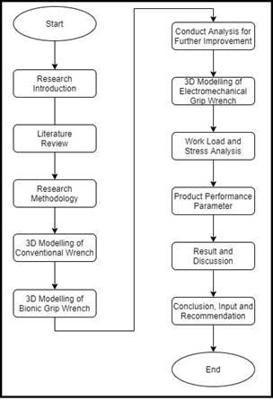 In research methodology phase, the overall process started with 3D mechanical drawing of conventional wrench product, 3D mechanical drawing of non-electrical bionic grip wrench and design the 2D and 3D engineering drawing of electrical-mechanical bionic grip wrench. Inventor software was used and we perform the stress analysis of the nuts gripper, considering it’s as a critical functional component. Figure 2 shows the development stage flowchart.