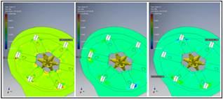 For the bionic grip arms section, Figure 7 shows the stress analysis performed by Inventor program. Analyzing the presented result, the product’s maximum stress is 0.9761 MPA with safety factor is 15. For displacement analysis, the maximum value is 8.152 mm, meanwhile, XX, XY and XZ section stress are shown on below Figure 8, with the value of maximum stress of 0.1646 MPa for XX section, 0.3139 MPa for XY section and 0.3579 MPa for XZ section.
