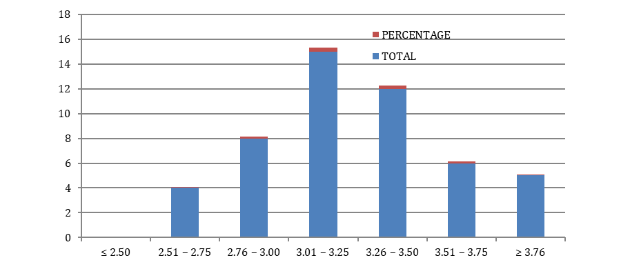Based on Figure 5, none of the respondents had a GPA below or equal to 2.50; 8% or 4 respondents have GPA ranging from 2.51 to 2.75; 16% or 8 respondents have GPA ranging from 2.76 to 3.00; 30% or 15 respondents have GPA ranging from 3.01 to 3.25; 24% or 12 respondents have GPA ranging from 3.26 to 3.50; 12% or 6 respondents have a GPA of 3.51 to 3.75; and 10% or 5 respondents have a GPA more than or equal to 3.76.