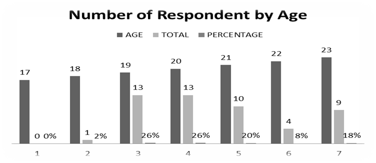 Based on Figure 3, 2% or 1 respondent is 18 years old; 26% or 13 respondents aged 19 years; 26% or 13 respondents are 20 years old; 20% or 10 respondents are 21 years old; 8% or 4 respondents are 22 years old; and 18% or 9 respondents are 23 years old.