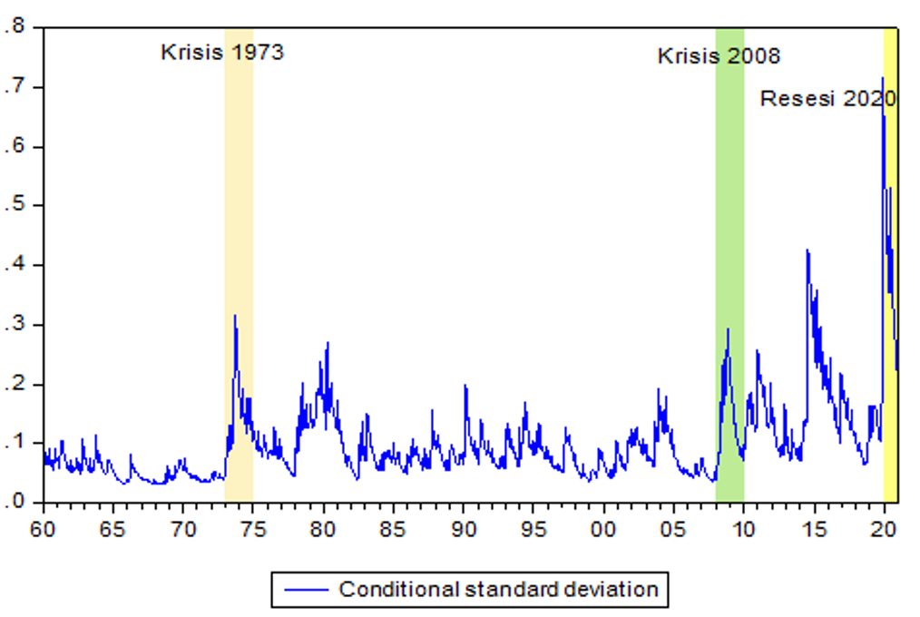 In this study, it is divided into 3 periods, namely the 1973 crisis, the 2008 crisis and the 2020 recession. This is because during these periods there were shocks in the economy. Figure 1 shows a graph of global beef price volatility during the period January 1960 to December 2020. High price volatility can be seen from the high peak of the graph. Beef prices in the 1973 crisis and the 2008 global crisis seemed more stable and less volatile. So it can be seen that the 1973 crisis and the 2008 crisis did not have an effect on global beef prices. Prices in the 1973 crisis and 2008 crisis remained stable because domestic and international supplies were still sufficient so that supply and demand were met. But what is of concern is that the highest volatility occurs in the 2020 recession, namely during the Covid-19 pandemic that spreads in various parts of the world. This is due to production disruptions from exporting countries which are constrained by cattle production due to certain policies during the Covid-19 pandemic. The imbalance between supply and demand causes prices to rise.