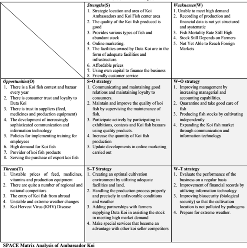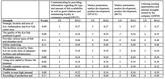 The matching stage is the second stage in strategy formulation and functions to combine the strengths and weaknesses found in UD. Prosperous Koi Ambassador with opportunities and threats from the external environment. At the matching stage (The Matching Stage) it is carried out which strategy is best used by the company following the formulation of the strategy at UD. Koi Ambassador [11].