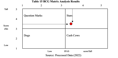 The results show that Ambassador Koi's position is in the Star position. In this position the company has a relatively strong position in the market and generates high sales volume but also requires significant investment. The company's strategy for the star position is backward, forward and horizontal integration as well as market penetration, market development and product development) [16,17].