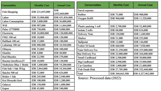 Operational costs are all costs incurred in daily activities in the koi fish business operations. Operational costs can be seen in the Table 2.