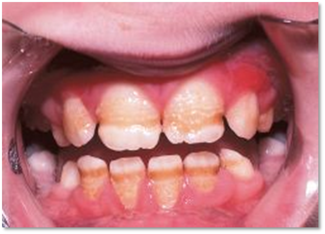Teeth are usually smaller than normal with a rough surface texture and extensive pits and grooves.