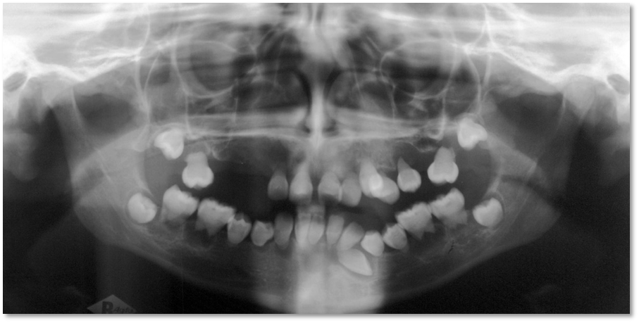 A marked reduction in the radiodensity of the enamel and dentine can be seen, which leads to a poor contrast between them. Classically, a “ghost-like appearance”(thus the name ghost teeth) of the teeth is observed. These teeth present with a shorter appearance, wide open apices, and a large pulp chamber.