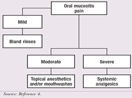 The main focus of mucositis treatment should be adequate management of pain and palliation of symptoms. With this in mind, the National Comprehensive Cancer Network (NCCN) Task Force on Prevention and Management of Mucositis in Cancer Care suggests a stepwise approach for the treatment of mucositis pain.