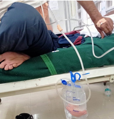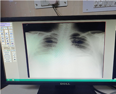 zone1, measured about 2.5cm–3 cm, incised wound, clean cut edges, gaping with no active bleeding no hematoma or any sign of vascular injury slight swelling was however present at injury site (Figure 1). On auscultation breath sounds were absent on left side chest and surgical emphysema was felt as crepitus while palpating on left side chest which was extending up to neck. Chest X-ray revealed left hemothorax with slight mediastinal shift (Figure 2). Patient was stabilized with IVF crystalloids 1 vac rush then at 110ml/hour, O2 inhalation, injection(inj.) diclofenac, inj tramadol, injemset, inj amoxyclav. Informed consent was taken and patient planned for intercostal drainage tube (ICD) insertion for haemo-pnemothorax. Part was cleaned and draped, local lignocaine 2% was infiltrated over superior aspect of rib in triangle of safety. ICD of size 32F inserted in 6th intercostal space in mid axillary line on left side chest and immediately gush of air with milky fluid was noted in under water seal. ICD was fixed and air tight dressing done. Approximately 400ml chylous drainage was noted within 1 hour (Figure 3). Diagnosis of thoracic duct injury was made and patient kept NPO on IVF and vitals monitored half hourly. Patient was kept in emergency department for observation. Chylous drainage of approximately 900ml was noted over 4 hours. Vitals of patient were stable but pnemothorax on chest and neck did not resolve. Spo2 of patient on O2 was 91% at 2L/minute. Patient kept in propped up position on oxygen and flow rate increased upto 4L/min to maintain saturation upto 94%. Telemedicine consultation was taken for further management, as tracheal and oesophageal injury could not rule out and in regional hospital setup nothing more could be done. Patient was referred with ICD to higher center for further evaluation & management. Patient was further referred from Shimla to Chandigarh then airlifted to Delhi and admitted in New Delhi were ENT, CTVS opinion taken. Patient was managed conservatively and discharged over 2-3 weeks as per information received from attendants.
