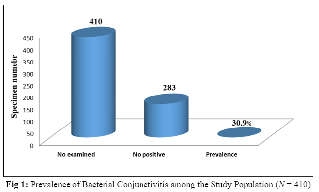 The percentage prevalence of bacterial conjunctivitis in the study population is 30.9%, bacterial agents isolated includes Staphylococcus aureus, coagulase negative Staphylococci, Escherichia coli, Pseudomonas aeruginosa and Proteus mirabilis. The limitation of the current study was that Chlamydia trachomatis, Corynebacterium species and anaerobic bacteria as well as prevalence of methicillin resistance among the isolated S. aureus responsible for bacterial conjunctivitis were not investigated due to resources problems; though, further studies will be conducted in this regard.