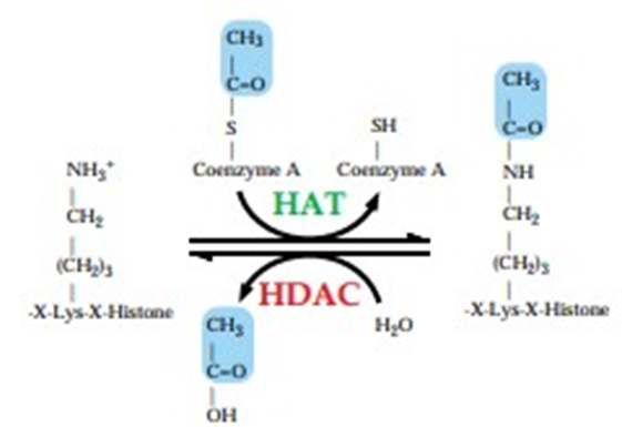 A group of enzymes that transfers acetyl group from acetyl coA to lysine sidechain containing epsilon amino group is known as HAT. Depending upon the mechanism of catalysis HATs can be classified into two classes such as HAT A localised in nucleus, takes part in transferring acetyl group from acetyl coA to lysine on histone & HAT B localised in cytoplasm, takes part in transferring acetyl group from acetyl coA to lysine residue on newly synthesised free histone [2,21].