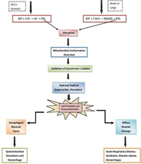 Phosphine is formed via both processes. Phosphine follows same pathway in both the cases and leads to mitochondrial damage by inhibiting Cytocohrome c oxidase. Hydroxyl radicals, thus, produced cause lipid peroxidation and protein denaturation. This mitochondrial damage in gastro-intestinal tract cause ulcers and hemorrhages and eventually renal and hepatic failure whereas it causes diffused alveolar damage in lungs leading to alveolar edema, hemorrhages and in many cases Ischemic stroke.