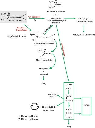 Metabolic fate of dichlorvos in human and other mammals of the organophosphates, dichlorvos is distinct for its rapid metabolism and excretion by mammals. Dichlorvos was not detected in the blood of mice, rats and