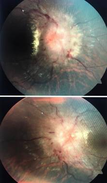 Figure 1: Fundus photograph of right and left eye of patient of neurocysticercosis showing stage v papilledema
