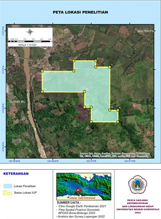 The research location is on the Paguyaman River, especially around the rock mining site in Motoduto Village, Boliyohuto District, Gorontalo Regency. Sampling location 1 is at coordinates N 0° 37'20.16", E 122° 36'28.68". Location 2 is at coordinates N 0° 37'4.02", E 122° 36'35.75" and sampling location 3 is at coordinates N 0° 37'4.03", E 122° 36'35.72". The research location map is shown in Figure 1.