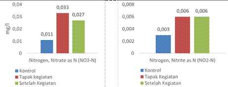 The total nitrogen oxides (nitrite and nitrate) in the activity site samples had higher total nitrogen oxide levels compared to the control. This is possible from agricultural waste and from the community livestock waste, but it is no longer suitable for the drinking water to be used.