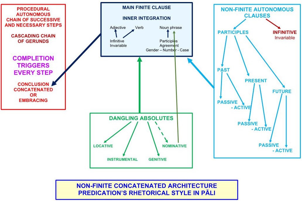 Pāli is an Indo-Aryan language that was devised specially to transcribe in the third century BCE the oral preaching of Gautama Buddha (who lived in the sixth-fifth centuries BCE) in Lumbini, Shakya Republic (present-day Nepal). Pāli is not so much an artificial language as a language adapted to the particular discourse it tries to transcribe and derived from probably several closely related other Indo-Aryan languages with Sanskrit being kept in the background all the time. Pāli has the originality not to be attached to a writing system so that it can be written with any of the writing systems in use in the Indian subcontinent and in Southeast Asia, including, in more recent times, the Latin writing system extended for some diacritic elements. We have to understand Buddhism is a particular development of old Sanskrit classic Vedas with the declared ambition to differentiate itself from the various trends and branches of Vedic and ascetic preaching that produced Hinduism. The main difference is the refusal of any godlike creator of the universe. Will study here the fundamental role of the four participles, the absolutive and the infinitive in the building of this predicatory discourse. The four participles are adjectival or nominal non-finite verbal forms predicatively expanding either noun phrases or verbal phrases with four possible forms and values: The past participle of an action seen as fully completed is an adjectival expansion of a noun phrase. The active past participle is an adjectival expansion of a noun phrase seen as the agent of an action that has been fully completed. The present participle is an adjectival expansion of a noun phrase with an action that is seen in progress, hence partly completed and partly virtual.The future passive participle is an adjectival form expanding a noun phrase with an action that should, must, or could be done with the contradiction between the injunctive or optative modalization and the passive completion attached to a noun phrase which is the virtual actant who should, must or could carry this completed passive value. The absolutive (at times called gerund) is a non-finite form that expresses an action or state that, at the time of utterance, has been completed, has been credited to the main actant of the main clause of the utterance or the general situation conveyed by the utterance, and whose completion and merit-crediting to the main actant make the action of the main clause of the utterance possible, and without which this very action is not possible. The infinitive is a simple non-finite verbal expansion of the main clause of the utterance attached to one particular actant of this main clause or to its verb to which it is subservient. It expresses the action in its fullness, though with various values in the sentences as for virtual completion, partial completion, or total completion.What kind of mapping of the inner time of these non-finite forms can we see and how can the passive/active and injunctive/optative dimensions be integrated? Are we in langue, or are we in discourse? Is such predicatory discourse dealing with time, both universe and inner times, the same way as any reporting discourse?