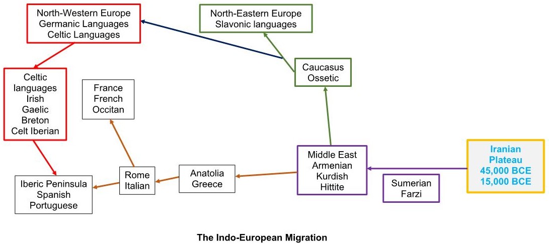 This is going to be a simple sketch of this twofold linguistic set that contains both the Indo-European and the Indo-Aryan families of languages with Farsi as the direct modern descendant of the original hot house in which the two families matured for thirty thousand years. The people behind this linguistic set arrived on the Iranian Plateau around 45,000-40,000 BCE and stayed there till after the Ice Age Peak. They came down from the Plateau in two directions. East, to evolve into the Indo-Aryan family, and West, to evolve into the Indo-European family. They found various populations in these areas after the Ice Age. They got into relationships with them and the languages that these people spoke, and the new arriving population (a minority according to DNA studies of various Indo-European-language speakers today, at the most 25%) who carried and phylogenetically produced, including in these contacts with these older populations, our modern Indo-European and Indo-Aryan languages that probably were influenced by the local pre-Indo-European or Indo-Aryan languages. These older languages were agglutinative languages of the vast Turkic family that occupied central Asia, the Caucasus, and the whole of Europe with modern-time groups surviving in the north (Sami people, Finns, and some groups in northern Russia, the Urals, and the later Hungarian migration from precisely this northern region in Russia and Finland. We must keep in mind most languages in the Caucasus are Turkic from Georgia, Abkhazia to Chechnya, Azerbaijan, and then around the Caspian Sea in Central Asia up to Siberia and the Urals.