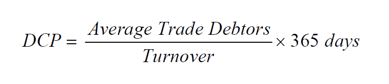 DCP ratio is calculated by dividing Trade debtors by Turnover and multiplies by 365: