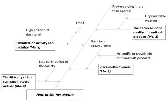 Dynamic risk related to the decrease in the quality of handicraft products (Mo. 1) was firstly identified. The quality of handicraft products made from wood, bamboo and rattan relies heavily on natural drying obtained from sun exposure. These products are not recommended to use dry-ing aids such as ovens because they can reduce the core quality. Using manual drying method, PT. AST had to take the handicraft products out of the warehouse to get sun exposure. At dusk, handicraft products must be put back into the roofed warehouse to avoid humidity from night dew. Lately, the weather has been unpredictable, so the drying products can not run optimally. Rain can fall at any time, sometimes without cloudiness. This makes the odd job men have to rush to re-enter the handicraft products inside the warehouse. Moreover, of course, the effort to put handicraft products back in the warehouse can be said to be less than optimal, considering the comparison of the number of craft products and the fewer odd jobbers who handle them.