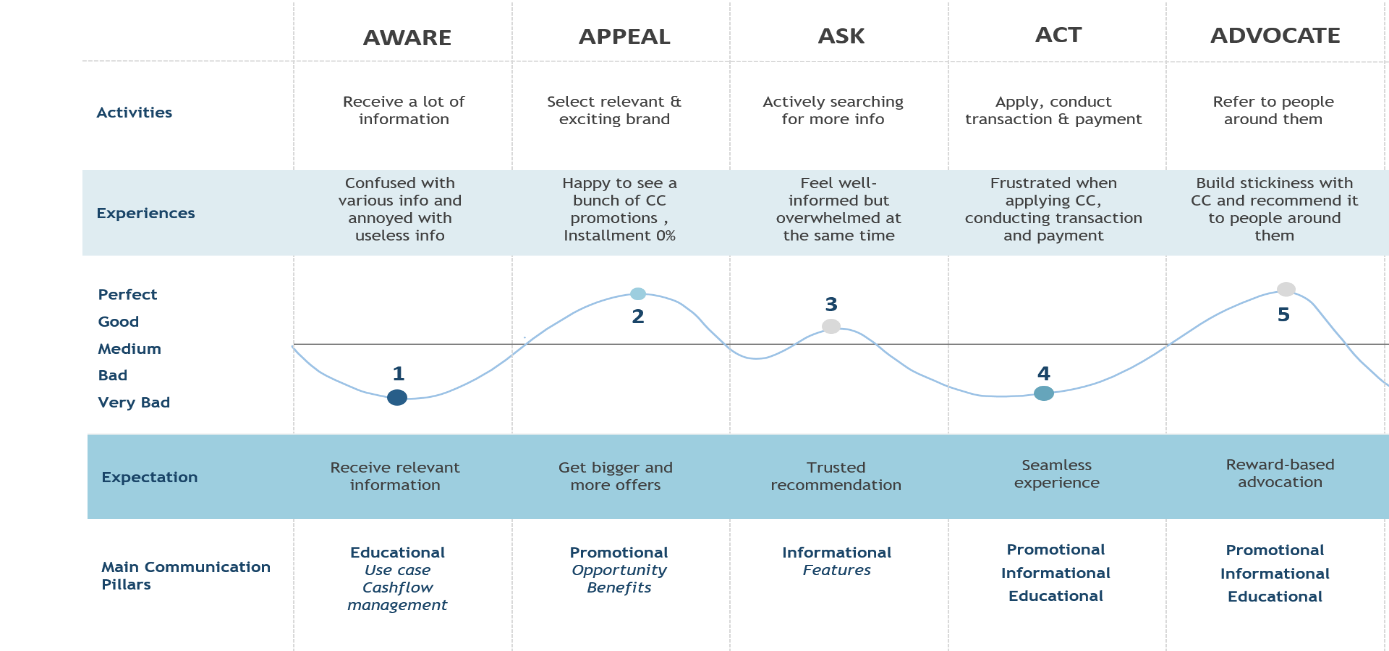 In aware stage, customers are bombarded with a lot of information. Therefore, they often feel overwhelmed and confused with available alternatives. It is not rare that they experience annoying marketing message that disturbs their daily activities. In this stage, what customers expect is relevant information with what their needs and wants. The propose communication pillar in this stage is education. Prodigy can start by communicating relevant use cases for customers. In addition, customers don’t buy a product, they buy emotion. This can be applied to many communication materials. For instance, when customers are about pay in gas station, many of them to go out from the car and pay, whilst contactless feature of Prodigy can make customers conduct effortless transaction. In the end, this message will lead into how customers can manage their cashflow without hassle with Prodigy Credit Card [31-32].