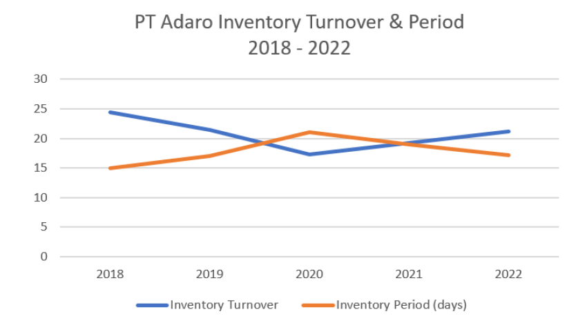 Between 2018 and 2020, the decreasing inventory turnover ratio suggests a slowdown in inventory sales or usage, whereas the increasing inventory period (days) highlights that the company took longer to clear its inventory, potentially pointing to lower demand or excess inventory. However, the upward trend in inventory turnover ratio and decreasing inventory period (days) between 2020 and 2022 signify that PT Adaro has successfully implemented strategies to improve inventory management efficiency, such as streamlining supply chain processes or optimizing inventory levels. This shows positive change in operational performance (Figure 12).