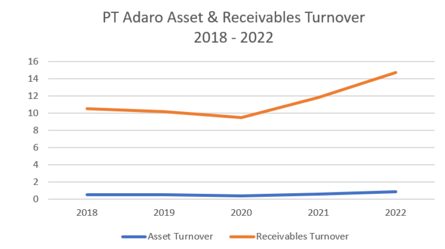 The trends observed in PT Adaro’s asset and receivables turnover ratios, both reaching all-time high in 2022, imply a marked improvement. The asset turnover ratio’s increased to 0.88 suggests that PT Adaro has effectively optimized its asset usage to generate more revenue. Also, the receivables turnover ratio reaches 14.74 meaning improvement in company’s credit management and collection process. A higher receivables turnover ratio mean that PT Adaro has been successful in converting its account receivable into cash more frequently (Table 3, Figure 13).