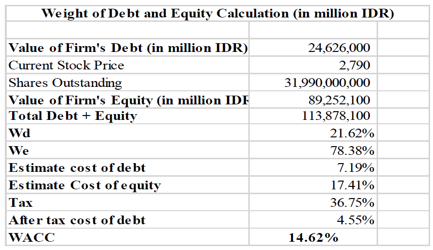 In calculating the cost of equity, first is to obtain the risk-free rate which is represented by the yield on long-term government bond which is 6.44%. Then, is to acquire the company beta, which measures the stock’s volatility in relation to the overall market. The beta is the adjusted beta found in Pefindo Beta Stock as of 06 April 2023. Then to obtain the equity risk premium, which represents the additional return investors require for holding a company’s equity over a risk-free investment, which is obtained from Professor Damodaran. The cost of equity is obtained from adding the risk-free rate to the product of the company’s beta and the equity risk premium. This value represents the expected return required by investors to compensate for the risks associated with holding the company’s equity (Figure 16).