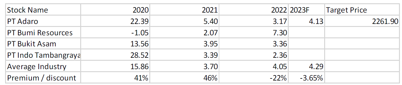 The Price to Earnings Ratio is a valuation ratio calculated by dividing the market price of a stock by its Earnings Per Share (EPS). Higher P/E ratio means that investors are expecting higher future growth in earnings while lower P/E ratio means that investors expect lower growth or they are more conservative on company’s future prospects. Through the author analysis, there is a pattern in which PT Adaro P/E Ratio has decreased significantly from 22.39 in 2020 to 5.40 in 2021 and then to 3.17 in 2022. The forecasted P/E ratio for 2023 is 4.13 which indicates a slightly more optimistic outlook for the company in 2023 compared to 2022. With 297 IDR as expected EPS for Adaro in 2023, the target price is multiplied to the average P/E for the industry (excluding Adaro) and this results to 1288.78 IDR.