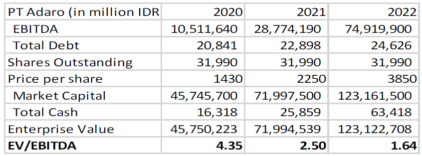 PT Adaro stock throughout the year of 2020 to 2022 is compared to its industry in terms of EV/EBITDA (Figure 21-23).