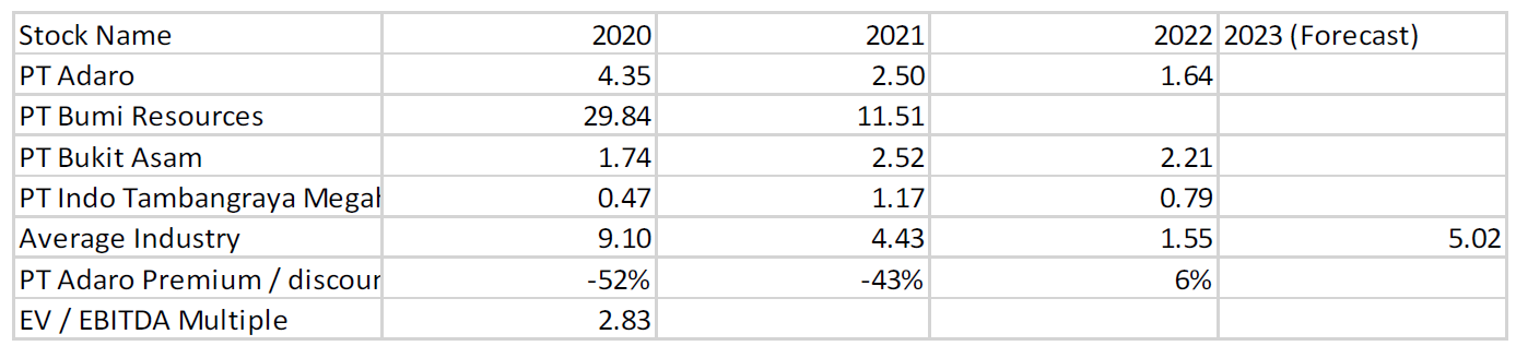 PT Adaro has experienced declining EV/EBITDA multiple that decreased from 4.35 in 2020 to 2.50 in 2021 and further to 1.64 in 2022. PT Adaro’s EV/EBITDA multiple has traded at a 52% discount to the industry average in 2020, a 43% discount in 2021 and a 6% premium in 2022. PT Adaro’s EV/EBITDA has been consistently lower than the industry average in 2020 and 2021, indicating that the stock may have been undervalued during these years.