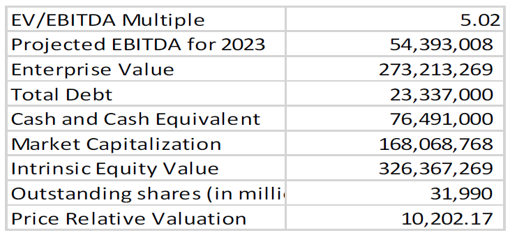 Next depreciation is added. Then, capital expenditures (CAPEX) and changes in net working capital are subtracted. Considering the 2022 economic growth rate of 5.31% and previously calculated WACC of 14.62%, the present value of future unlevered free cash flows are obtained by discounting them using WACC. The present value of the terminal value, which represents the perpetuity of cash flows beyond the projection period, is also calculated using similar discounting approach. The enterprise value is obtained by summing the present values of free cash flows and terminal value, while the equity value is derived by subtracting net debt from enterprise value. Finally, the intrinsic value per share, in this case 5300, is calculated by dividing the equity value by the total number of outstanding shares. The intrinsic value per share is 5300, higher than the current stock price which is 2790 (Figure 18).