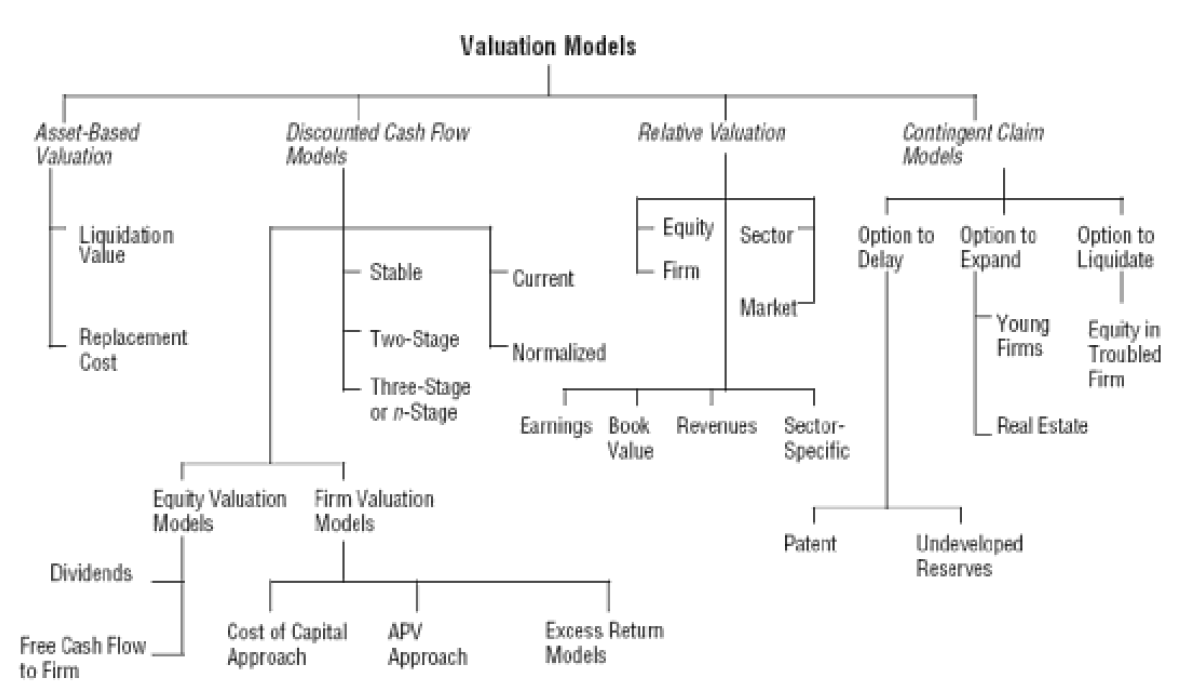 Damodaran [16] identified three methods used for evaluations-relative valuation, discounted cash flow valuation, asset-based valuation and contingent claim valuation (Figure 4).