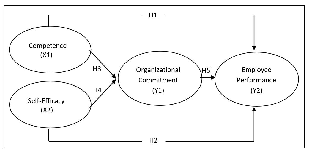 This study was made using independent variables, namely Competence (X1) and Self-Efficacy (X2) on the dependent variable, namelyEmployee Performance (Y2) with the intervening variable, namely Organizational Commitment (Y1). The following is a picture of the research model from the framework in this study: