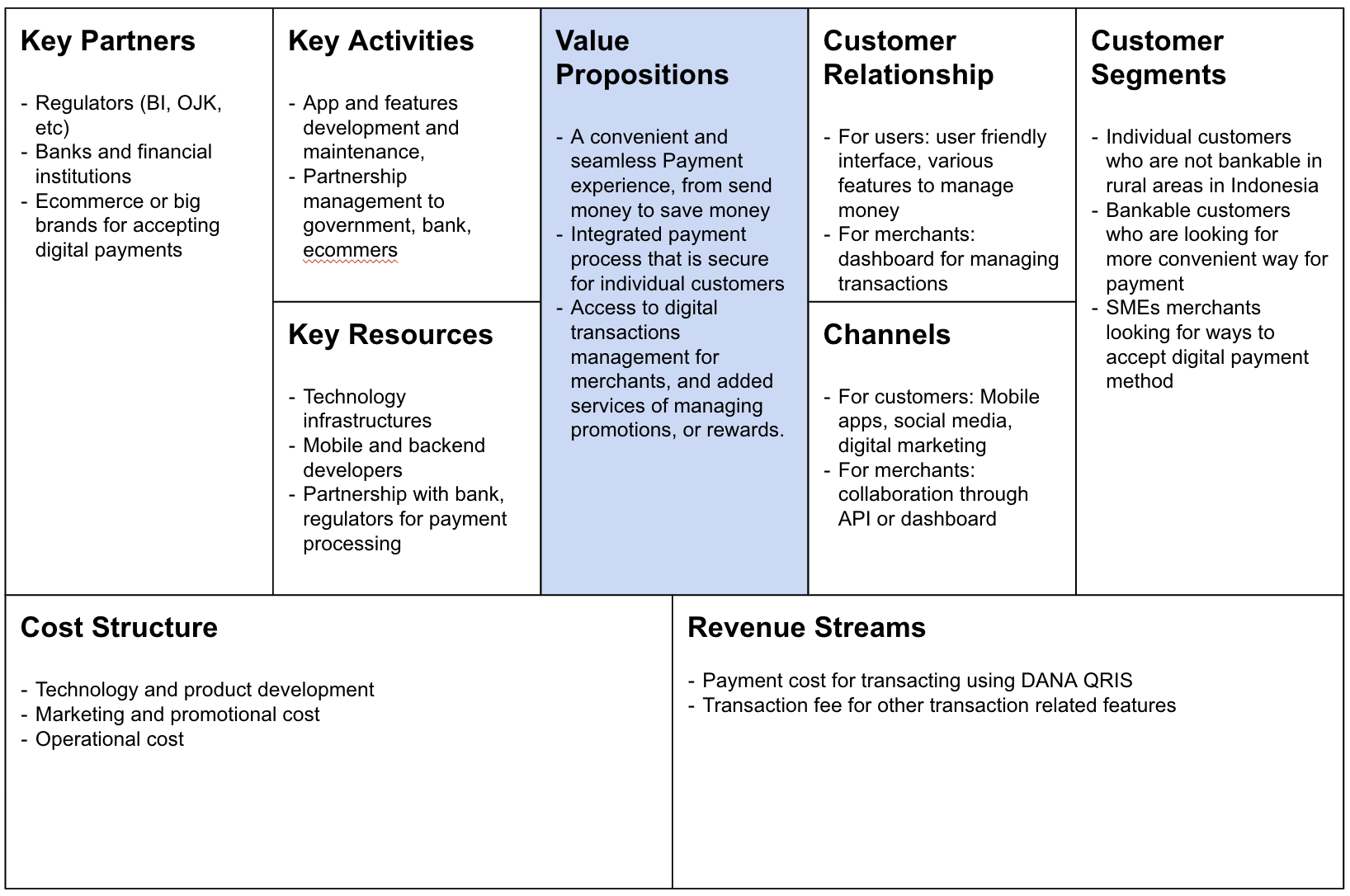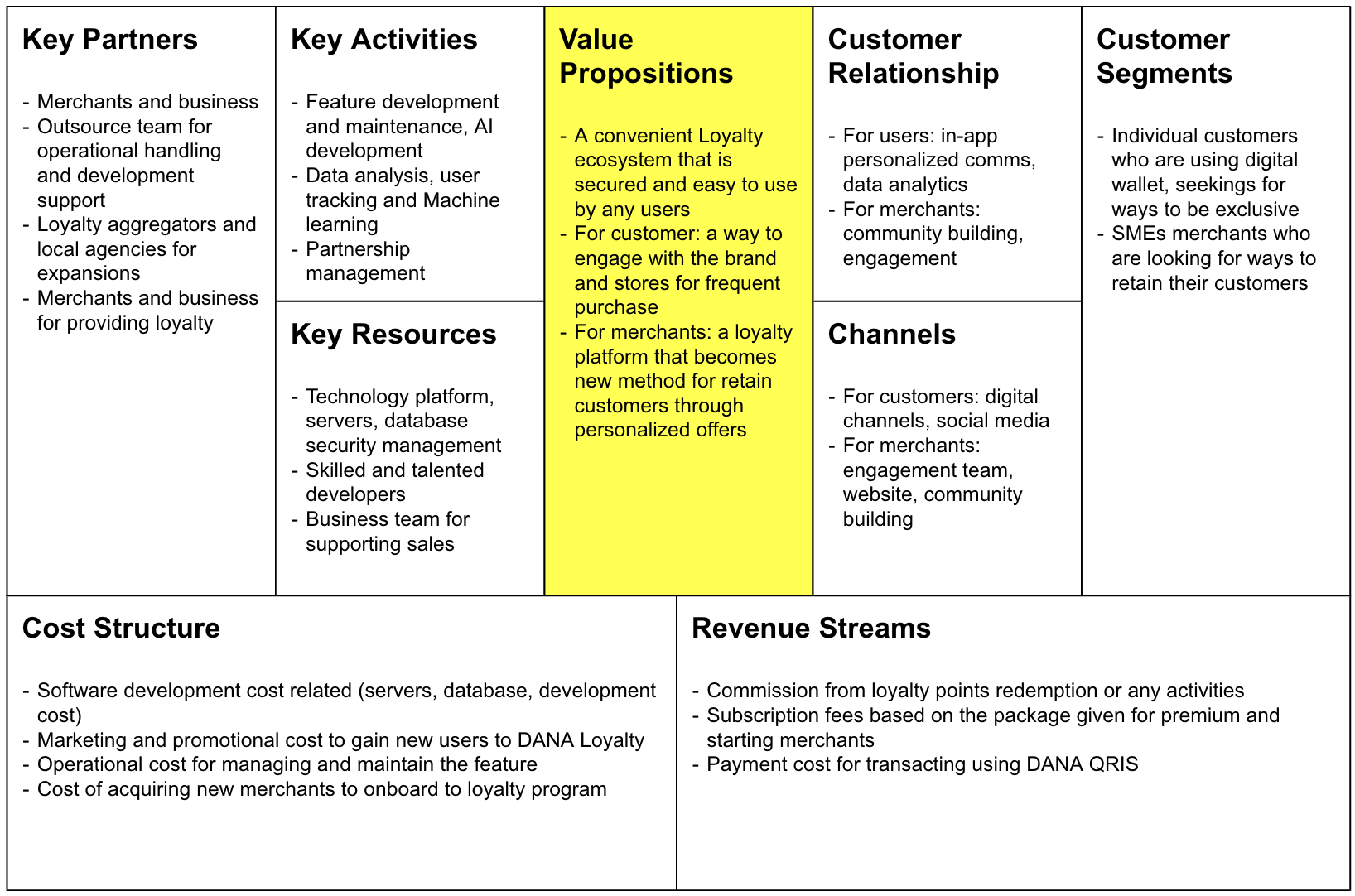 As shared from the current business model of DANA, loyalty is just an additional value proposition for merchants to accept DANA as their payment method. The revenue will only rely on the payment and transaction fee for using DANA. Hence, based on the insights of industry attractiveness, as well as potential demand from customers and merchants, a new business model canvas is proposed to innovate new ways for delivering the value of Loyalty platform to the customers. The new and developed prepositions will give DANA Loyalty on building a community of Loyalty Program, monetization, and continuous improvement to provide value for its customers [26].