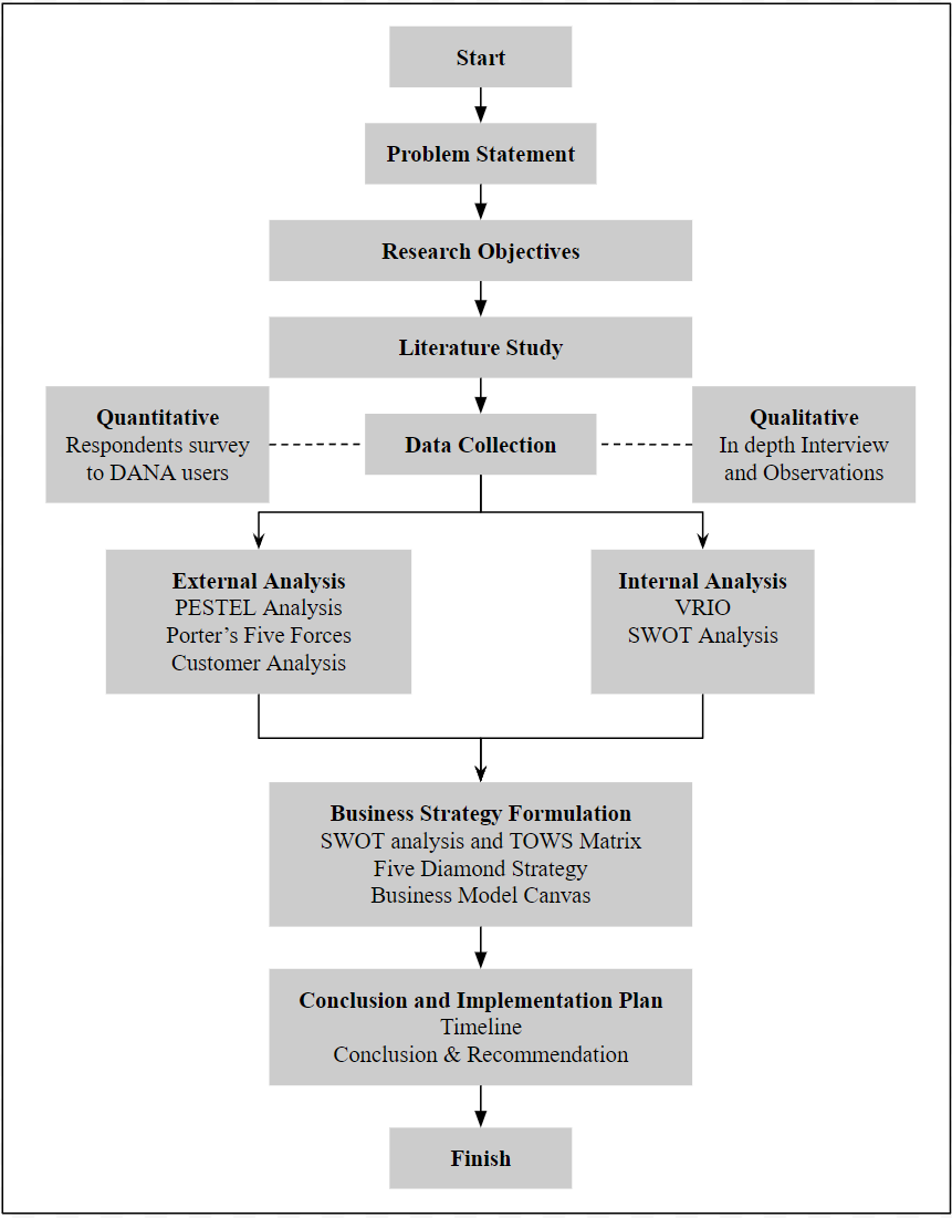 To achieve the research objectives by providing conceptual framework that is using Business Model Canvas, authors will gather primary and secondary data from existing customers of DANA (application user and SME merchants) through quantitative and qualitative method, underrated internal and external analysis, create a business strategy formulation and established establish business model canvas for DANA loyalty feature.