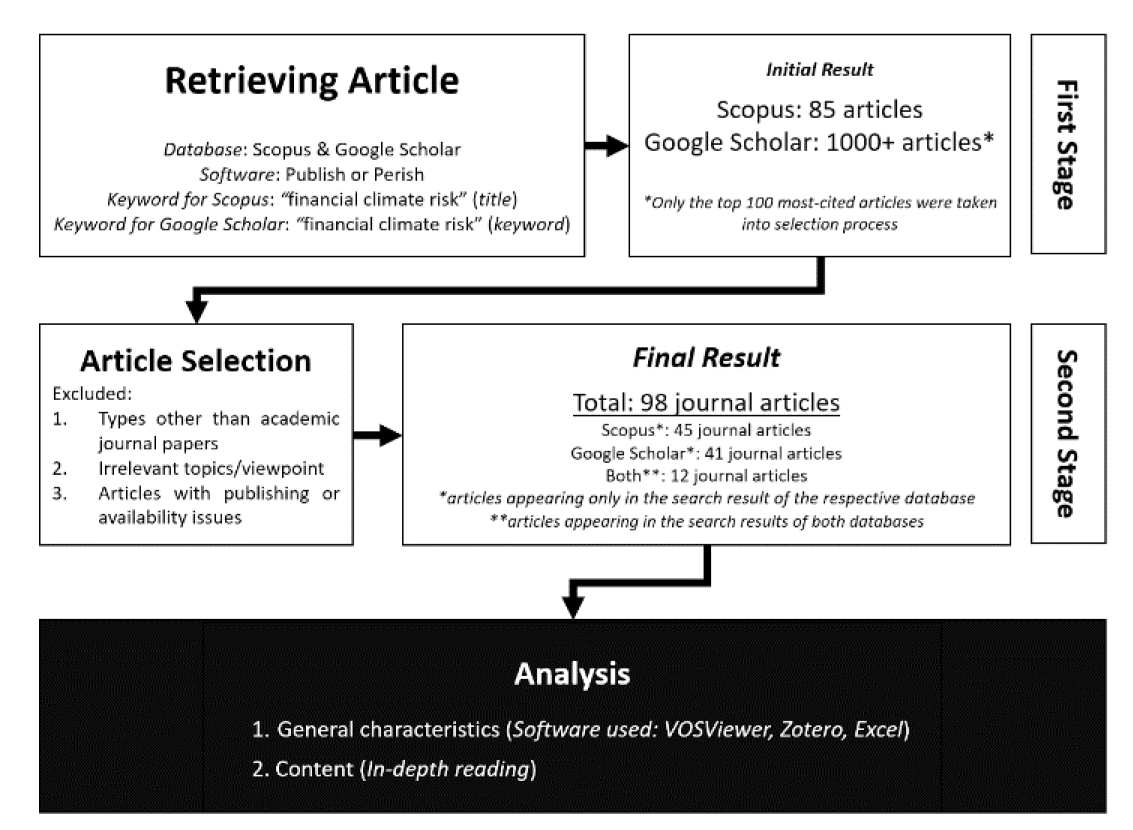 We utilize the Publish or Perish software by Harzing to search the Scopus and Google Scholar database. The software enables a more time-efficient database search and provides the possibility of extracting the search result to external software for further processing. The keyword we employ for our search in the database is “financial climate risk”, with the keyword specified as “title” in Scopus and “keyword” in Google Scholar. For initial search using the Publish or Perish software, we do not employ any restrictions for publication type, while the time of publication covers up to February 2023. Our initial search yielded 86 articles from Scopus and over 1000 from Google Scholar. We take all articles yielded from Scopus into our selection process. On the other hand, we take into our selection process only the 100 most cited articles from Google Scholar, given the high number of articles yielded from the database.