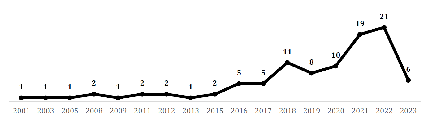 We first analyze the trend of climate financial risk publications according to their time. Figure 2 shows the number of climate financial risk publications for each year between 2001 and February 2023. Despite the inconsistent number of publications in its initial years, the literature on climate financial risk has increased considerably in the last decade. There has been an unprecedented uptick in annual publications each year after 2015, which coincides with the speech on the risk of climate change on financial stability by Mark Carney, the former Governor of the Bank of England [40]. The year 2022 contains the highest number of publications on climate financial risks, with 21 articles published. The last eight years saw the publications of over 85% of the articles. This finding indicates the increasingly growing interest in understanding climate financial risks.