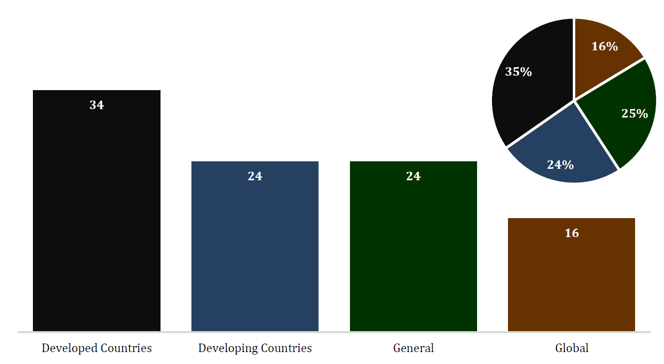 We further analyze the articles according to their primary objects of study. Within this measure, we divide the objects of study into four types: developed countries, developing countries, global (cross-country studies with no developed or developing country focus), and general (no geographical definition in the object of the studies- the scope applies to the literature in general). Figure 3 shows the number of articles and their shares to total articles based on their object of study. A significant part of the selected articles focuses on developed countries- accounting for the highest number of 34 articles or 35% of the total number of articles. European and North American countries are these articles' primary objects of study.