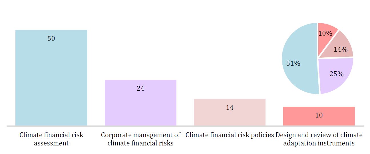 The second largest groups of articles focus on developing countries and the general context, both at 24 articles or 24-25% of the total articles each. China is the primary object of study within these articles, while other developing countries account for a smaller number of articles. Articles studying the global context account for the lesser part, at 16 articles (~16% of the total). The challenge of using the global economy as an object of study in climate financial risk research lies in the climate impact and economic structure differences of various countries, which complicate the establishment of the global linkages between climate change and financial risk. In analyzing the content of the selected articles, we find four primary issue categories: climate financial risk assessment, corporate management of climate financial risks, climate financial risk policies, and design and review of climate adaptation instruments. Figure 4 provides the number and share of articles based on these content categories. Publications assessing the financial risk of climate change are the largest group at 50 articles or 51% of total articles. This finding indicates a growing interest and the necessity of more precisely understanding the financial risk of climate change.
