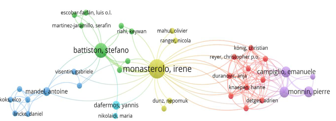 Table 3 presents the top authors based on the number of articles they provide to our list. Authors not included in the table contribute fewer articles to our list. Total link strength “indicates the total strength of the co-authorship links of a given researcher with other researchers” [41]. Irene Monasterolo and Stefano Battiston contribute the most to our list, with eight and five documents each. Their work on climate financial risk assessment provides significant advancements in methodological frameworks, including climate stress tests, stock-flow consistent (SFC) models, and greenhouse gas indices.