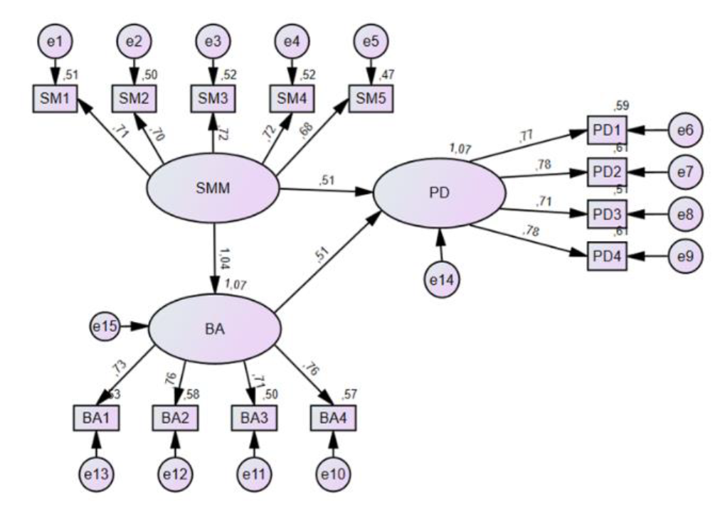 | BA | <--- | SMM | 1,076 | ,084 | 12,866 | *** | Accepted |