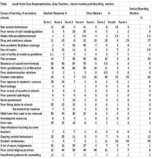 The main purpose of the study was to investigate the causes of arson to secondary schools in Homa Bay County, Kenya.