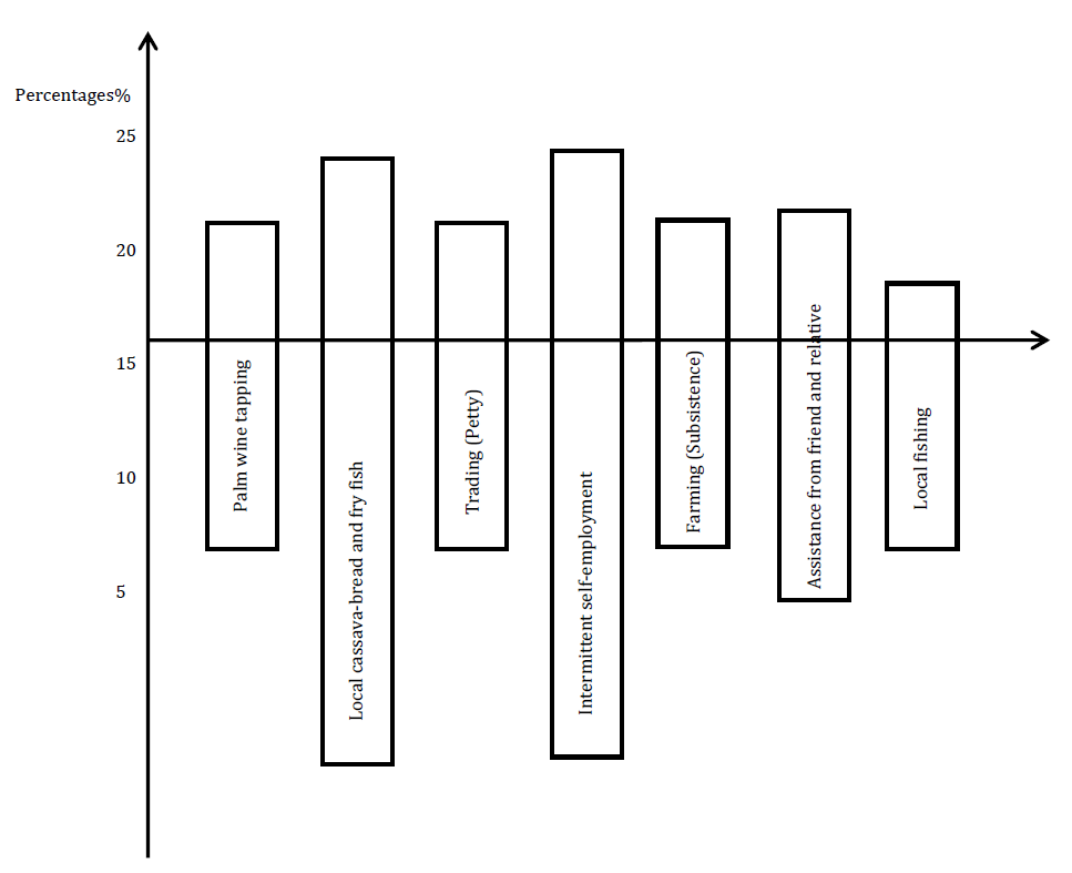 From the table, it shows that (30%) of the income earned is from cassava-breed and fry fish production, (28%) of the income earned as a coping mechanism is from trading. Also, (13%) of income is earn from intermittent self-employment, 14% of income is earn through palm wine tapping and selling.