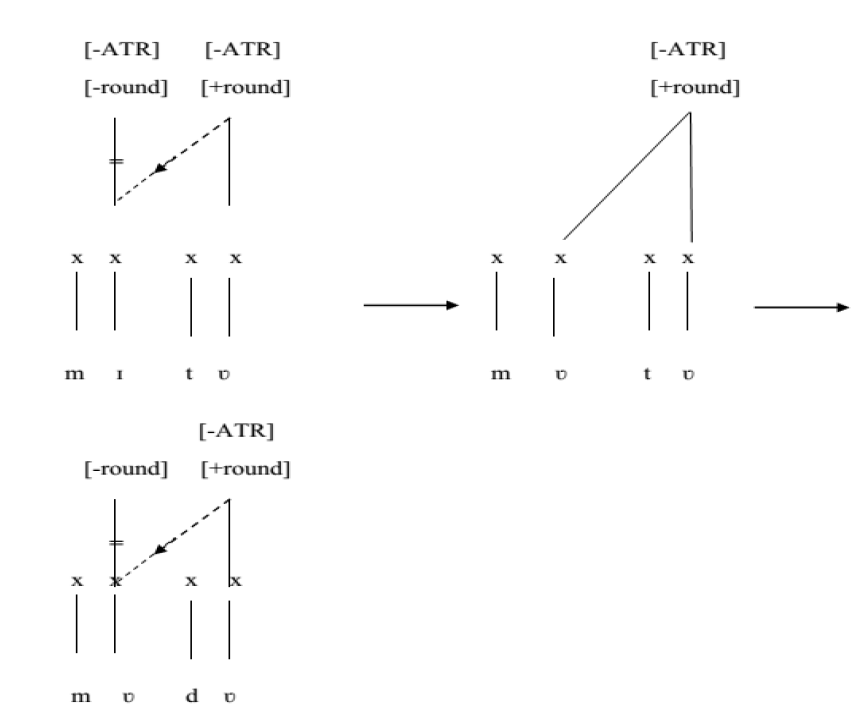 Rounding harmony has been exemplified in the in the examples above. The first-person pronoun me has a -ATR vowel therefore vowel harmony is complete here. Firstly, the apical coronal consonants to which /t d/ belong are high sounds like the vowel high back vowel /ʋ/ therefore, /ʋ/ and /t/ are similar in height but not in voicing, Walker et al. [25]. There is also an occurrence of coronal harmony in /t d/ and the vowel /ʋ/, [26-30]. Highness, the common place of articulation for /ʋ/ and/t/ is also conducive for mutation. There is therefore an occurrence of partial mutation in that, the alveola voiceless plosive /t/ has copied the voicing feature regressively from the rounded high back vowel /ʋ/. This assertion is based on the fact that /t/ already occurs with a voiced sound /ʋ/ but remains voiceless when in isolation until attached to mʋ in mʋtʋ ndwomi tobecome mʋdʋ ndwomi. The voicing feature might not have come from the initial bilabial nasal /m/ because the nasality might have also docked on the /t/ to turn it into a nasal consonant. This would have made the phrase *mʋmʋ ndwomi. This is best described as partial mutation since the sounds involved are a vowel and a consonant.