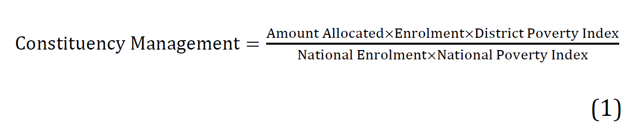 Since then, all Secondary education management funds were sent to the constituencies where they were disbursed through the constituency development fund committee in the understanding that communities are better placed to identify the poor among them. The objectives of the fund schemes included increasing access to Secondary Schools, enhancing transition and completion rates in Secondary Schools, and reducing disparities and inequalities in the provision of Secondary School education [16]. The kitty intended to assist the following group of students: orphans, children from poor households (especially those with no incomes), children from ASAL areas and urban slums, the girl child and children in difficult circumstances, those with special needs and girls rescued from difficult circumstances including early marriages and pregnancies (MOE Circular Ref. No. G9/1/V11/101 dated 22nd April 2005). The fund allocation to each constituency is calculated based on the number of students from the constituency enrolled in Secondary Schools in Kenya, the natural Secondary School enrolment, the district poverty index and the national poverty index. The formula used to allocate management to the constituencies is: