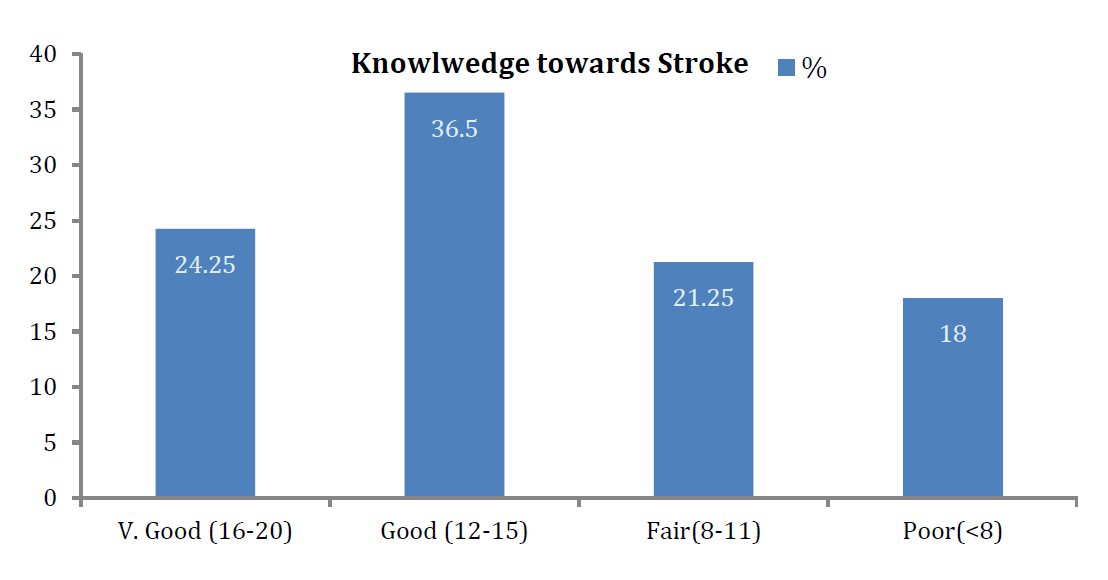 In the present study 24.25% (97) participants had very good knowledge (16-20 marks) towards Risk and Preventive factors for Stroke, 36.5% (146) had good knowledge (12-15 marks), 21.25% (85) had fair knowledge (8-11 marks) and 18% (72) having poor knowledge (<8 marks).