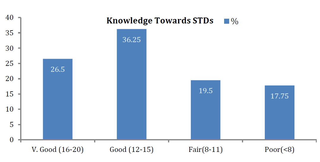 In the present study 26.5% (106) participants had very good knowledge (16-20 marks) towards Sexually Transmitted Diseases, 36.25% (145) had good knowledge (12-15 marks), 19.5% (78) had fair knowledge (8-11 marks) and 17.75% (71) having poor knowledge (<8 marks).