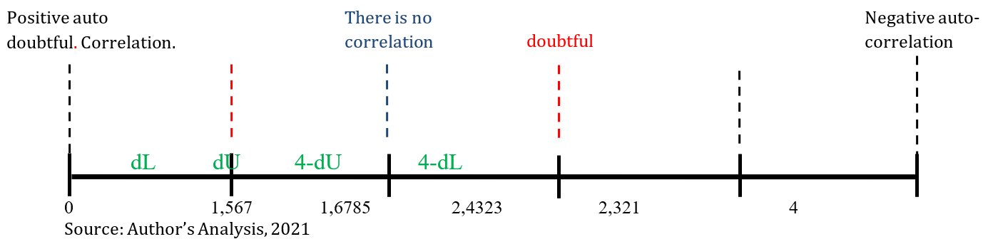 The Durbin-Watson value stated on the SPSS output is called the calculated DW. This number will be compared with the acceptance or rejection criteria that will be made with the dL and dU values determined based on the number of independent variables in the regression model (k) and the number of samples (n). The dL and dU values can be seen in the DW Table, with a significance level of 5% (α = 0.05).