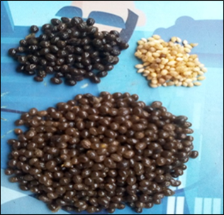 Firstly, the seeds were collected together (Figure 1c) and separated into white, black and orange based on differences in the colour observed (Figure 1d). The white ‘inviable’ seeds (Figure 1d) (upper right) were discarded while the remaining black seeds (Figure 1d) (upper left) and orange seeds (Figure 1d) at bottom were packed in plastic bucket separately. The different seeds were then washed separately inside plastic containers under running tap water in the laboratory. After washing, it was observed that some of the orange coloured seeds submerged while some float. But all the black coloured seed submerged under the water, these were further separated and named accordingly as orange submerged, orange float and black submerged.