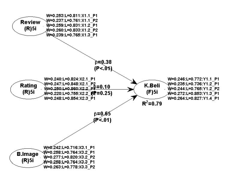 Variables have cronbach's alpha values above 0,60 and composite reliability between 0,60-0,90 except for the online customer rating variable (X2) which has a composite reliability value of 0,916. According to Statkomat [23], if the composite reliability value is still in the range of 0,90–0,10 or below 0,95 it is declared acceptable. Each research variable has fulfilled cronbach's alpha and composite reliability is reliable and three variables have instrument consistency as a measuring tool and the results can be trusted when used in other studies with the same phenomenon.